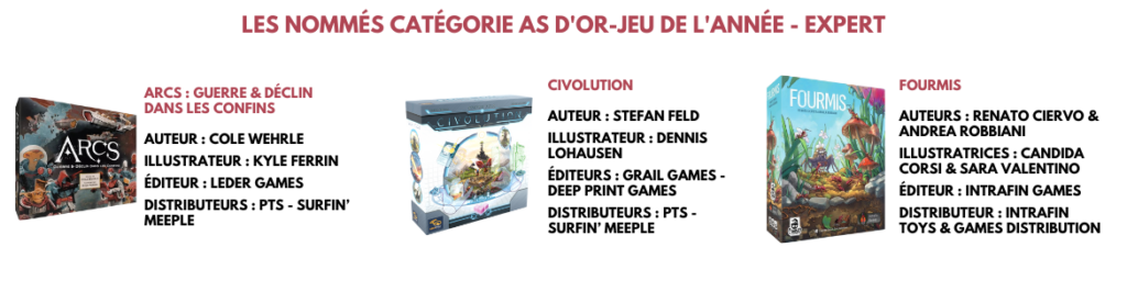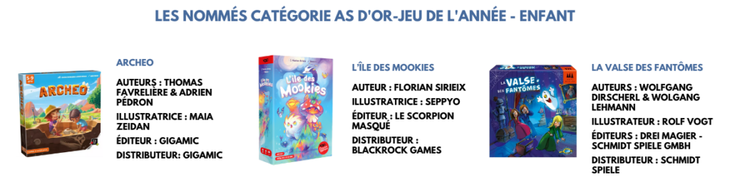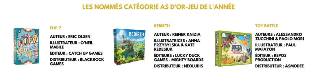 Les lauréats seront annoncés lors de la Cérémonie de l’As d’Or qui se déroulera le 26 février à partir de 20h30 à l’occasion du Festival des Jeux de Cannes.