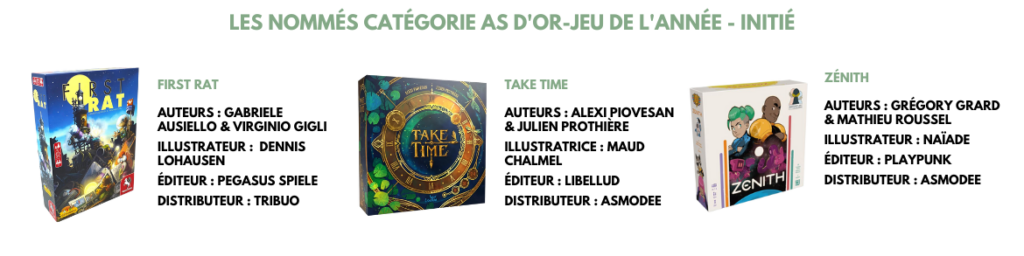 Je ne suis pas surpris de la nomination de Take Time que je n’ai que peu apprécié. J’aurais cent fois préféré voir Ritual ou Eternal Deck dans la liste des nommés de cette catégorie. Zenith est sympa mais là aussi sans gros coup de cœur non plus. Bref, cette année, la sélection initiée me parait bien fade.