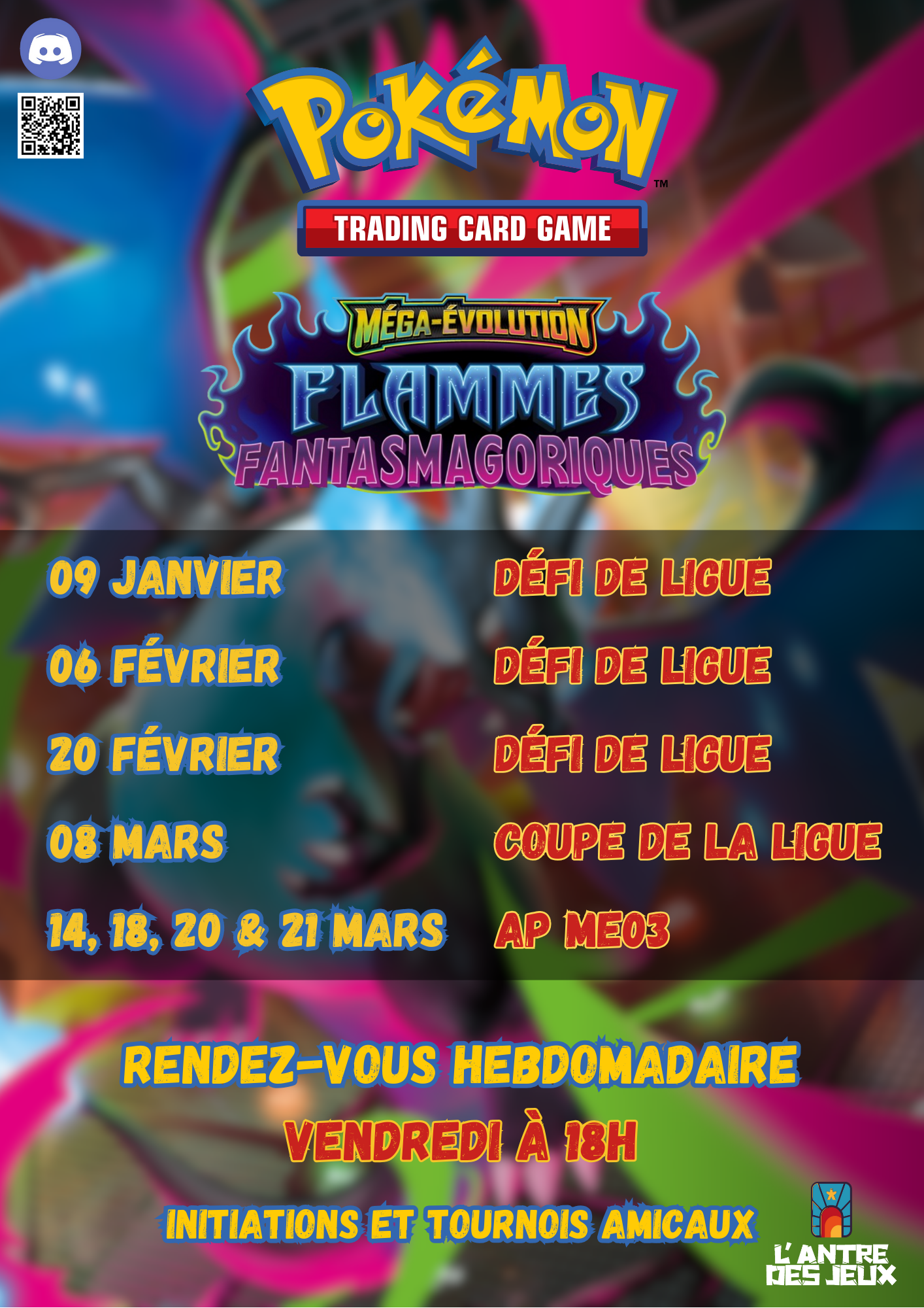 Voici le programme des événements majeurs à venir pour cette saison Pokémon – Méga-Évolution Flammes Fantasmagoriques ! Comme toujours, 3 Défi de Ligue sont prévus ainsi qu’une Coupe de la Ligue, et nous finirons la saison avec l’Avant-Première de la série suivante : Héros Transcendants !