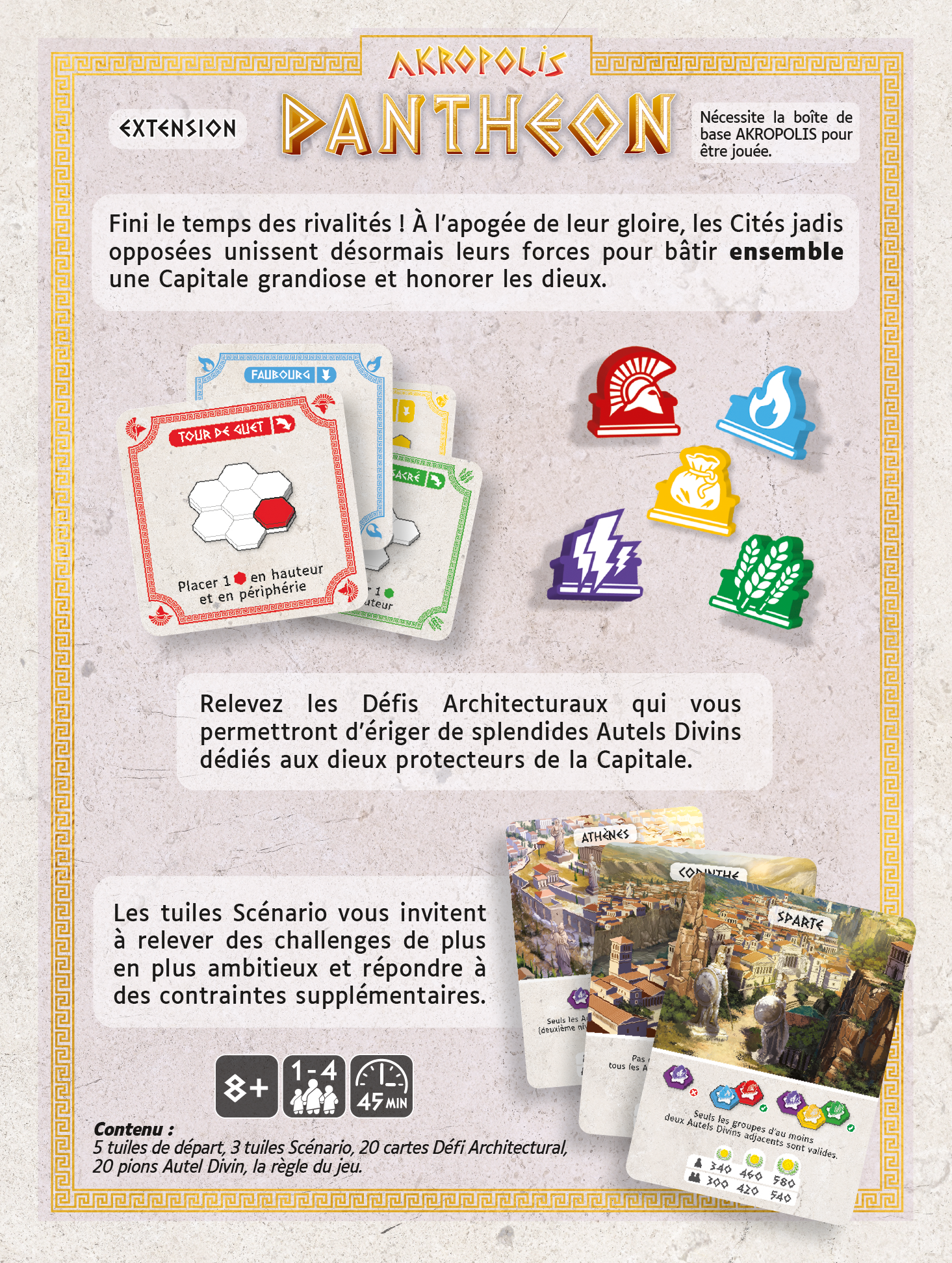 Après Akropolis et Akropolis Athéna, découvrez une nouvelle façon de bâtir avec Akropolis Pantheon, une extension 100% coopérative. Les joueurs ne cherchent plus à rivaliser, mais à s’allier pour ériger la plus grande et la plus harmonieuse des Capitales. Chaque décision compte : posez judicieusement vos tuiles, coordonnez vos choix et optimisez vos quartiers pour atteindre ensemble les objectifs communs imposés par les dieux de l’Olympe. La gloire n’appartiendra plus à un seul, mais à toute la communauté de bâtisseurs ! Points forts : •Une nouvelle expérience coopérative pour Akropolis. •Des objectifs divins à accomplir ensemble. •Une rejouabilité renforcée grâce à la variété des défis. Saurez-vous unir vos talents pour satisfaire le Panthéon et bâtir une Capitale immortelle ?