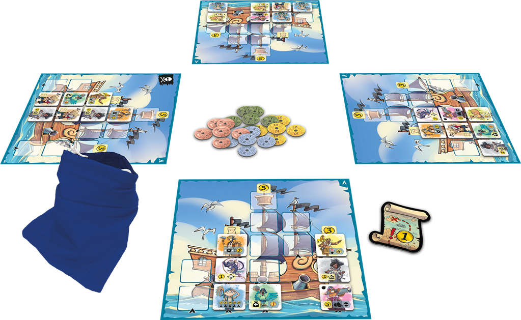 Trouvez les synergies et bonnes combinaisons entre les différents membres d’équipage en les plaçant au mieux sur votre plateau. Quand un joueur a rempli toutes les cases de son navire, le tour se termine et la partie prend fin. On applique les bonus de fin de partie sur les tuiles, et le capitaine qui possède le plus de pièces d’or remporte la partie.