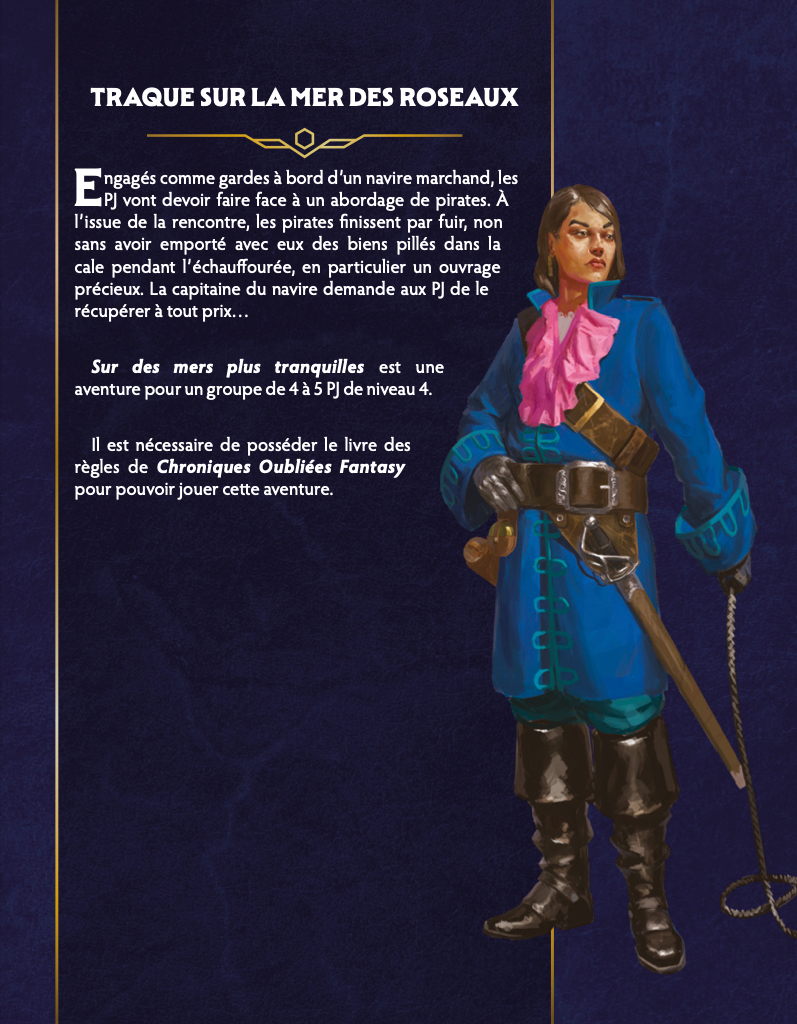 Engagés comme gardes à bord d’un navire marchand, les PJ vont devoir faire face à un abordage de pirates. À l’issue de la rencontre, les pirates finissent par fuir, non sans avoir emporté avec eux des biens pillés dans la cale pendant l’échauffourée, en particulier un ouvrage précieux. La capitaine du navire demande aux PJ de le récupérer à tout prix… Sur des mers plus tranquilles est une aventure pour un groupe de 4 à 5 PJ de niveau 4.