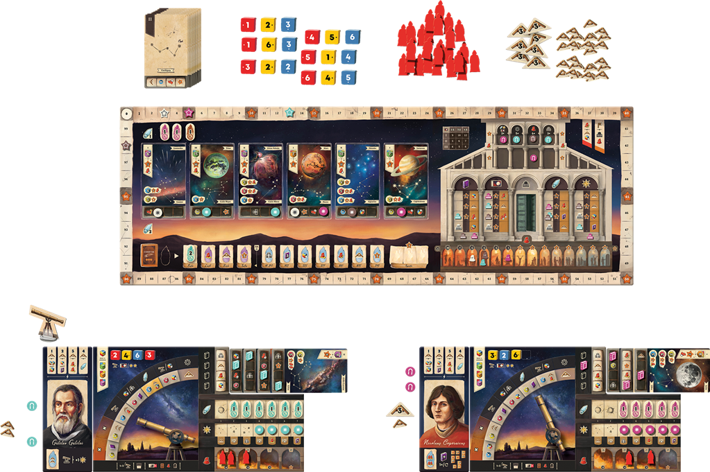 Explorez les astres, collectionnez des découvertes, avancez à l’université… mais gare à l’Inquisition, qui surveille chacun de vos faits et gestes. Si vous ne persuadez pas ses émissaires, votre réputation en souffrira. Chaque astronome possède des capacités asymétriques uniques, renforçant la rejouabilité et la variété stratégique.