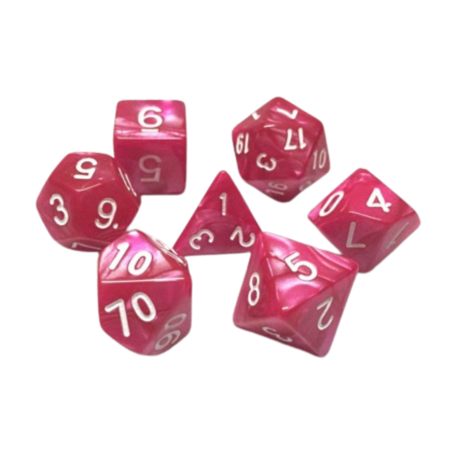 Lot de 7 dés fuchsias, gravés et nacrés, avec des chiffres en blanc.