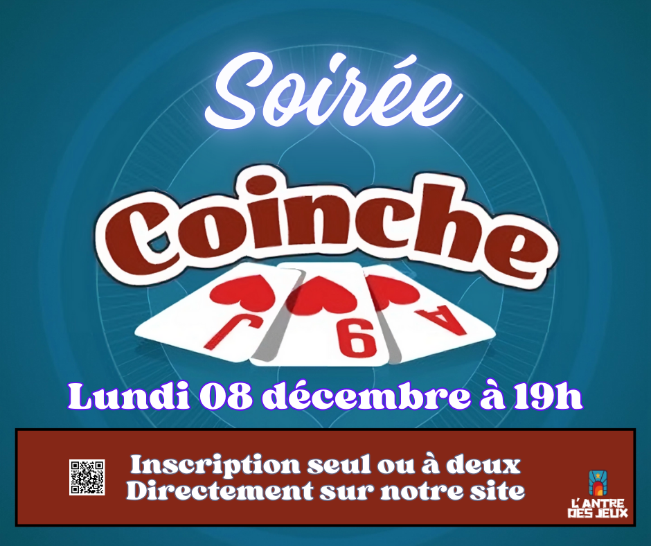 Ce lundi 08 décembre, retrouvez une nouvelle soirée coinche, rendez-vous à 19h à l’Antre !