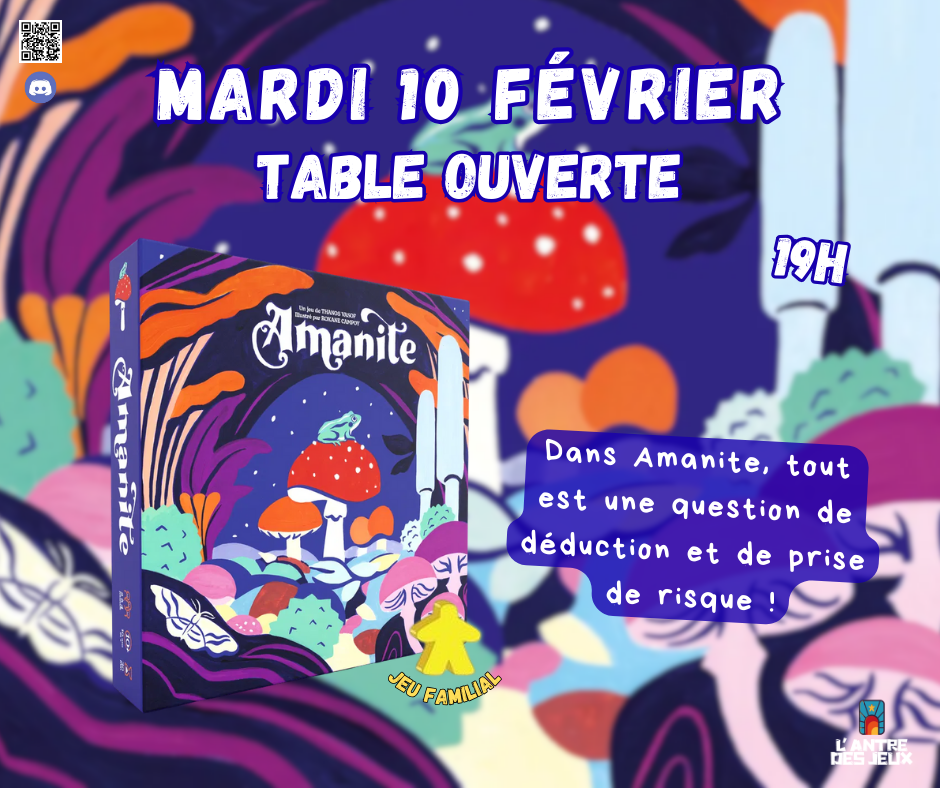 Ce mardi 10 février, venez découvrir Amanite lors de notre soirée jeux de société, le rendez-vous des joueurs des Hautes-Alpes, rendez-vous à 19h à l’Antre !