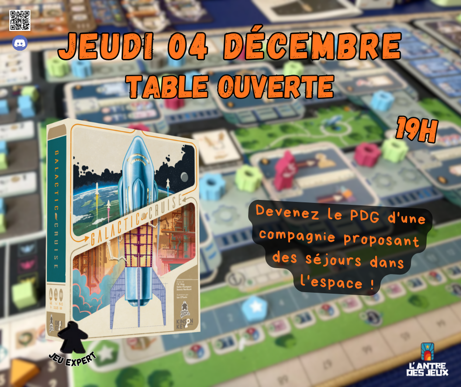 Ce jeudi 04 décembre, venez découvrir Galactic Cruise, jeu de stratégie expert, rendez-vous à 19h à l’Antre !