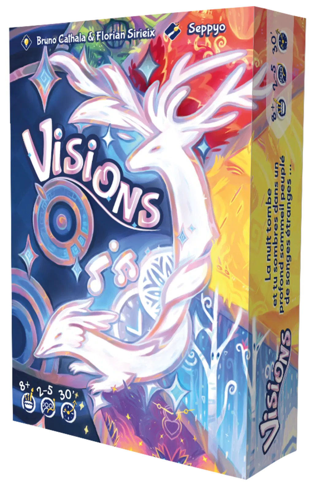 Visions te plonge dans un univers onirique somptueux, porté par une mécanique simple et pleine de profondeur. Assemble des songes pour créer des rêves et marque un maximum de points avant la fin de la nuit… déclenchée lorsque la pioche s’épuise ou qu’un joueur se réveille trop tôt.