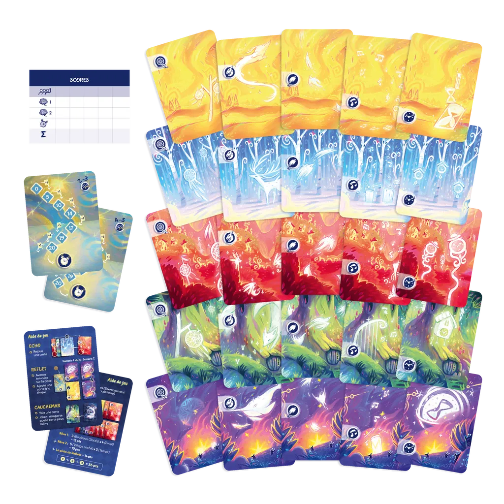 Dans cet univers féérique, ajoute à chaque tour un nouveau songe à tes rêves. Fais les bons choix : plus tes rêves sont cohérents, plus tu marqueras de points. Utilise habilement les effets tactiques des Échos et des Reflets pour prendre l’avantage sur tes adversaires, et déclenche des cauchemars au moment opportun pour perturber leurs plans.