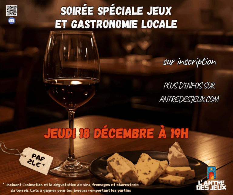 Ce jeudi, nous vous proposons une soirée spéciale de jeux et de dégustation de produits locaux, rendez-vous à 19h à l'Antre !